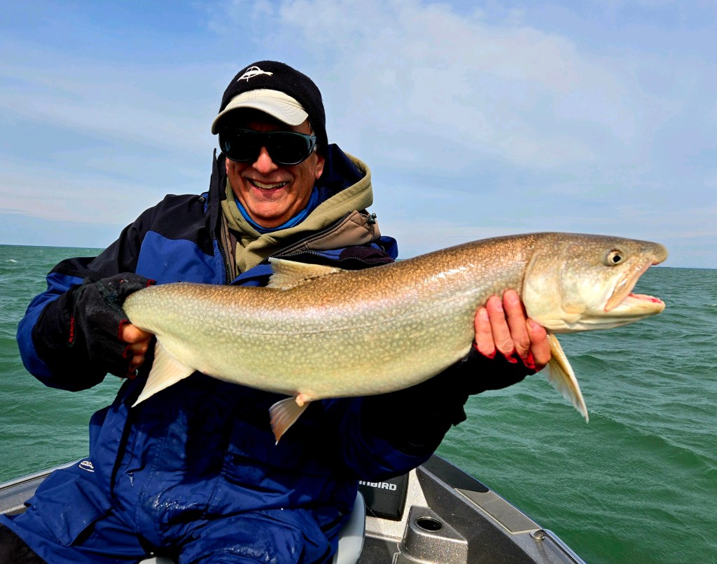 I had two more hits and landed two more lakers. The fish were a bit scattered, but we would get one, maybe two each time we drifted over a hump that had a huge ball of bait on it. The rest of the fish that we caught were all on the backside of a hump. We each caught three fish. The waves were steadily building and each time that we moved back up to reset the drift we all said that it was the last drift. We knew we had to head to the calm of the river soon. But on each drift we would pick up a fish or have a hit, so we would do one more last drift.